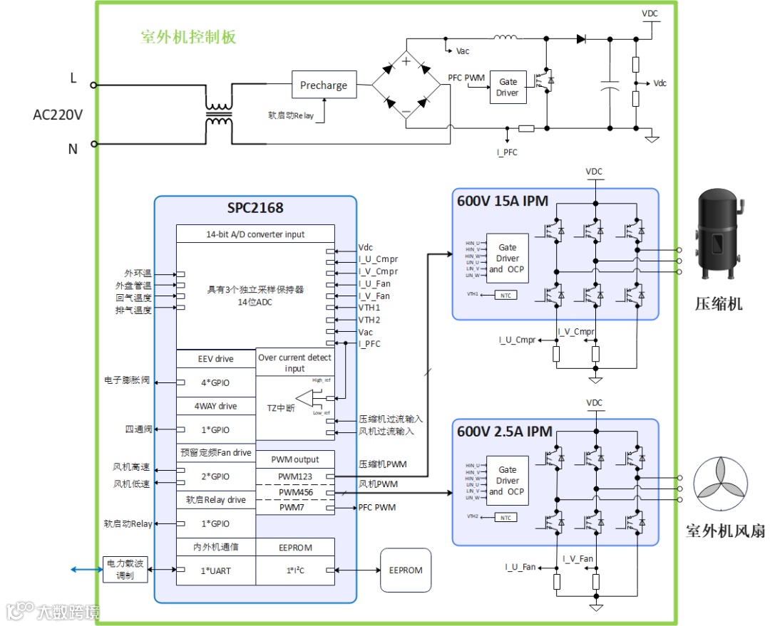 该外机控制板集成功能包括:PFC控制、压缩机控制、外风机控制、电子膨胀阀控制、多路温度采样、四通阀控制、电力载波通信等