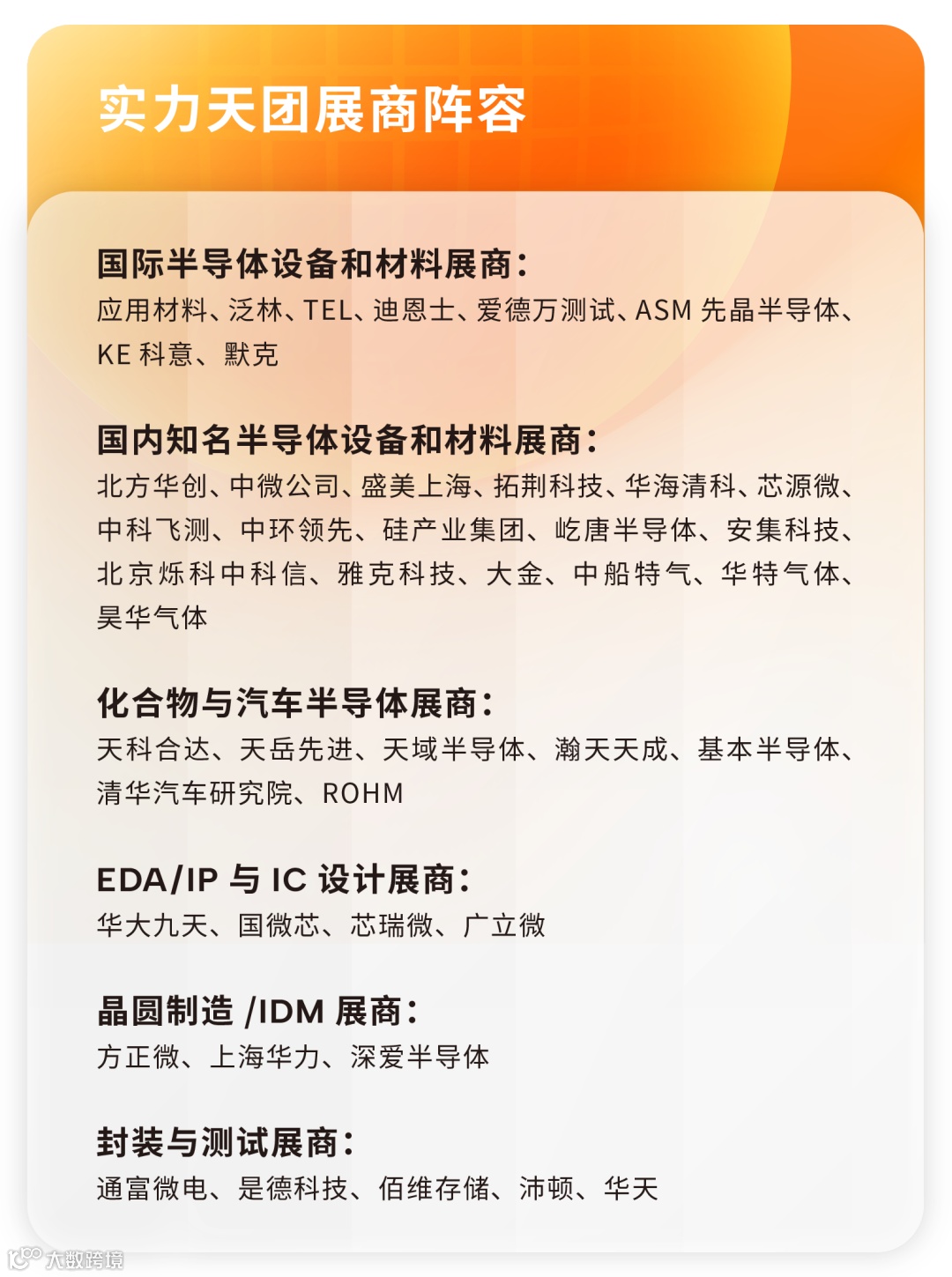 本次展会汇聚行业翘楚,展商阵容星光熠熠,目前已成功吸引众多国内外半导体龙头企业参展,包括应用材料、泛林、TEL、ASM先晶半导体、KLA、北方华创、中微公司、盛美上海、方正微、通富微电、华大九天、天科合达、日立高科技、爱德万测试等。展商们将携旗下先进技术、最新产品与解决方案精彩亮相,共筑一场产业链上下游面对面交流盛会。