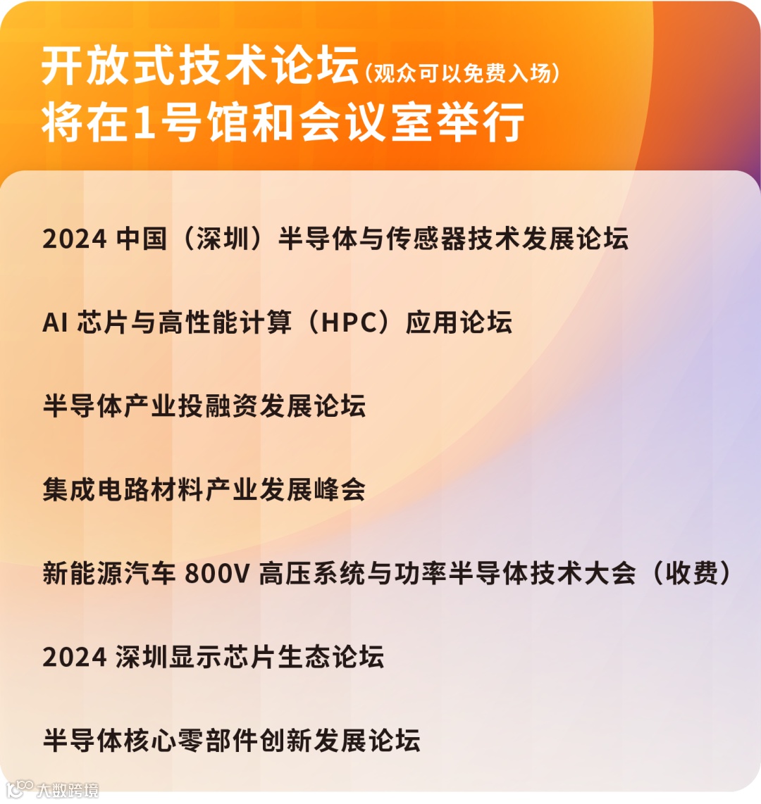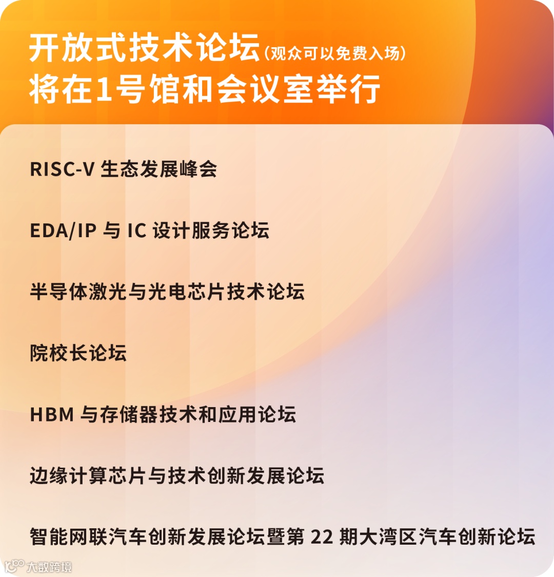 与湾芯展同期举行的湾区半导体大会包括:高层闭门交流会、盛大开幕式、高峰论坛、院(校)长论坛、投资论坛、人才发展论坛,以及20多场涵盖半导体制造和IC设计的技术论坛。