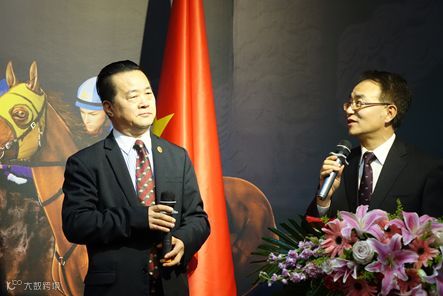 中国马业协会秘书长岳高峰先生(左)向泰王国纪拉崆亲王(右)赠送礼物