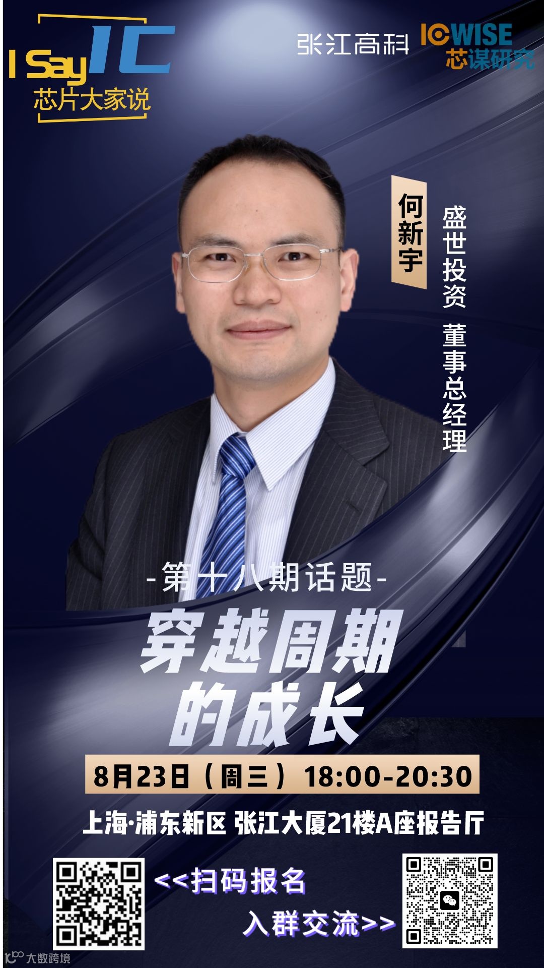 2023年8月23日(周三)晚六点,由张江高科与芯谋研究共同主办的“芯片大家说”产业沙龙第十八期线下活动将在张江大厦与大家再次见面。本期活动成功邀请到盛世投资董事总经理何新宇博士,他将就“穿越周期的成长”这一话题进行精彩分享。