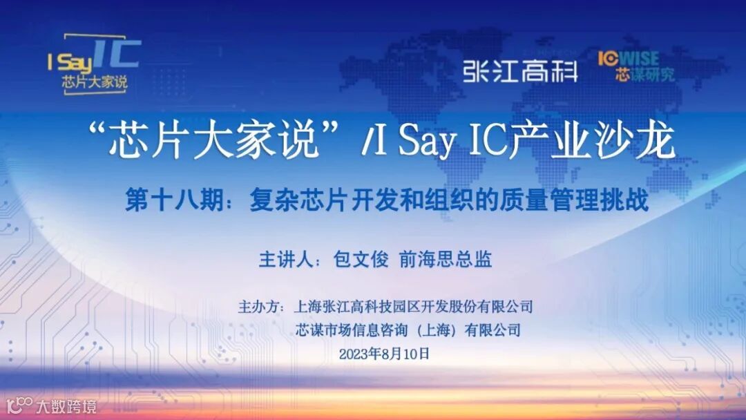 2023年8月10日(周四)晚六点,由张江高科与芯谋研究共同主办的“芯片大家说”产业沙龙第十八期线下活动将在张江大厦与大家再次见面。本期活动成功邀请到前海思总监包文俊,他将对“复杂芯片开发和组织的质量管理挑战”这一话题进行精彩分享。