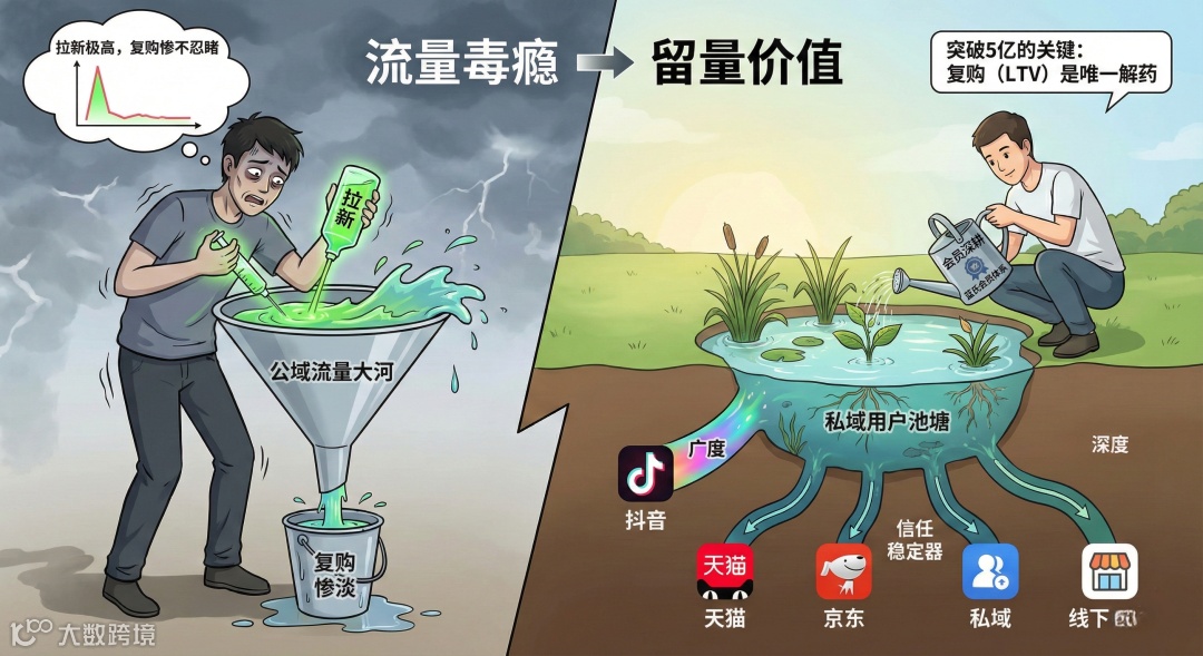 既然拉新越来越贵,那么复购(LTV)就是打破内卷的唯一解药。很多陷入陷阱的品牌,后台数据往往是“拉新占比极高,但复购惨不忍睹”。突破5亿的关键,在于将视线从公域的“流量大河”收回到私域的“用户池塘”。