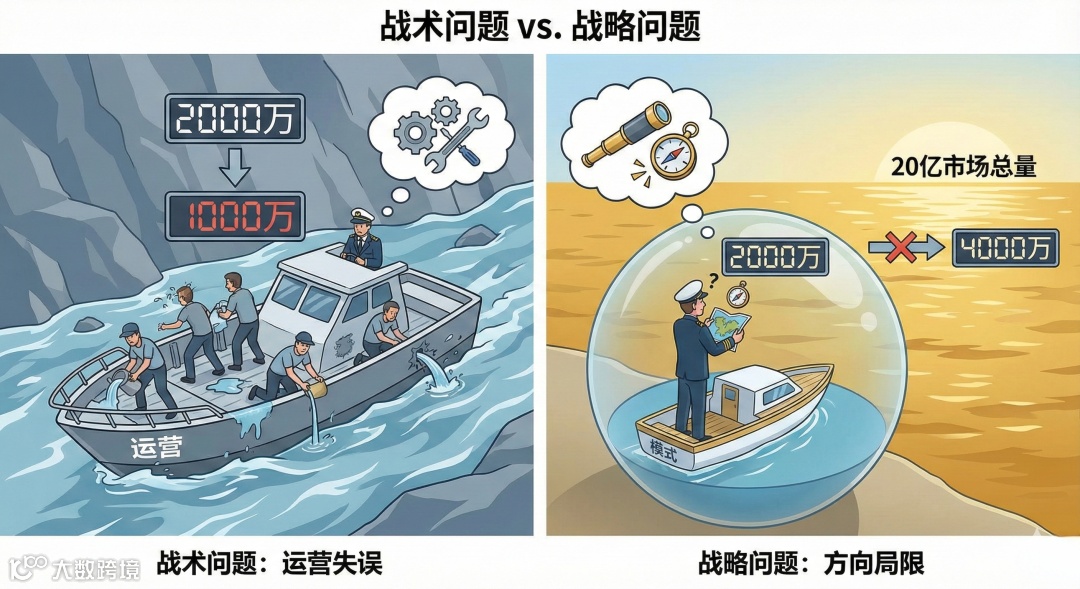 宠经说经过大量研究,发现一个务实的思考模型(如有不对请指出):如果你的存量本该是2000万,因运营失误掉到1000万,那是战术问题;如果2000万是合理的,但市场总量有20亿,你却死活做不到4000万,那就是战略方向的问题。
