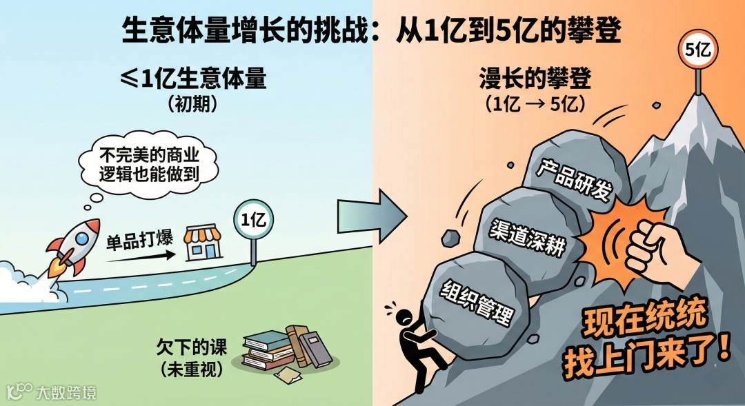 根据观察,1亿内的生意体量,有时候甚至不需要完美的商业逻辑,打爆一个单品就能做到。但从1个亿到5亿,是一场漫长的攀登。品牌做不上去,是因为你在1亿之前欠下的课——产品研发、渠道深耕、组织管理——现在统统找上门来了。