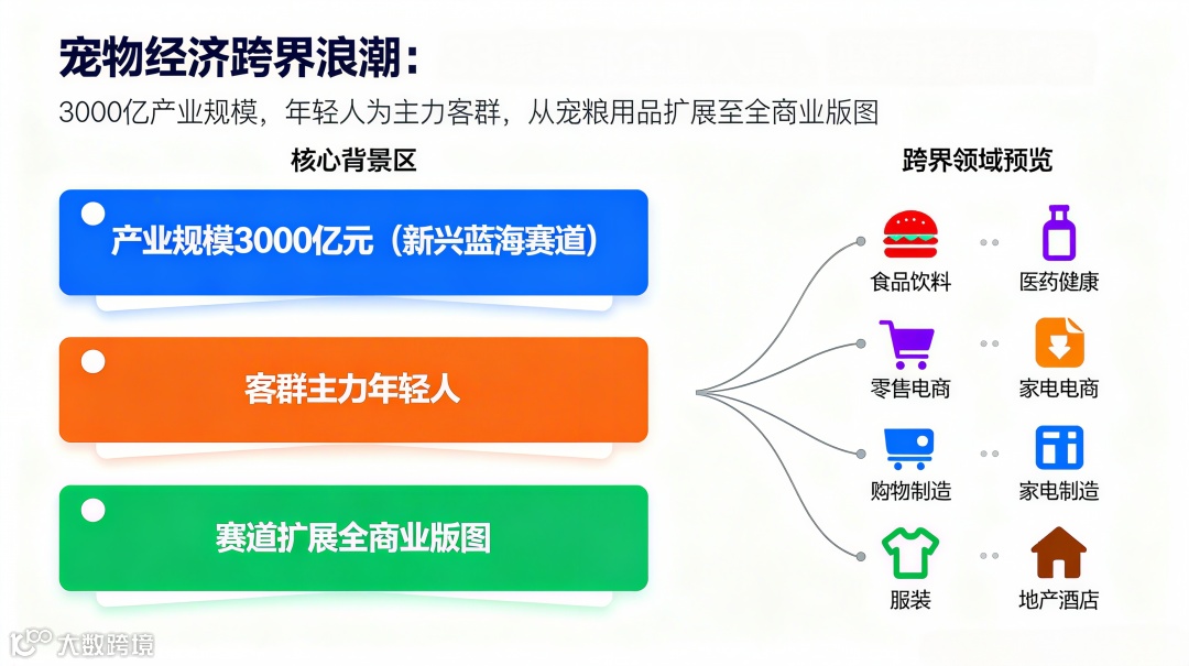 食品饮料、医药健康、零售电商、服装日化、地产服务,甚至家电制造……原本跟宠物稍微有间接关系的企业,如今纷纷把目光投向这条新兴赛道。它们的加入,也让宠物经济不再只是宠物品牌的专属舞台,而逐渐成为更大商业体系里的一块拼图。