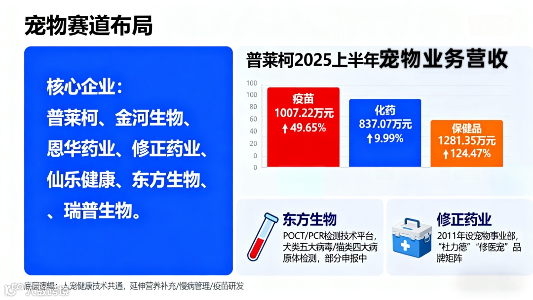 医药与健康产业同样活跃。普莱柯、金河生物、恩华药业、修正药业、仙乐健康、东方生物、瑞普生物等企业积极布局或加码。其中,普莱柯2025年上半年宠物相关产品的销售收入表现亮眼。宠物疫苗收入1007.22万元,同比增长49.65%;宠物用化药收入837.07万元,同比增长9.99%;宠物用保健品收入1281.35万元,同比增长124.47%。