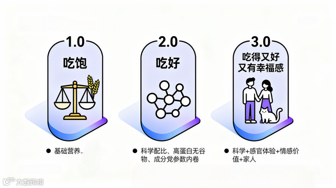 2.0“吃好”阶段:关注科学配比,以“高蛋白、无谷物、进口”等为关键词,进入“成分党”和“参数内卷”时代。