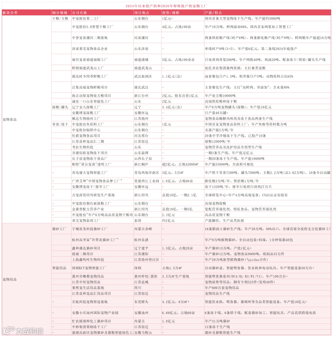 据宠经说不完全统计,2024年以来,行业整体扩产增速趋势明显。中国宠物行业新工厂投资总额超80亿元,已投产或即将投产的大型工厂达44个。(排除宠物医疗及兽药端)。