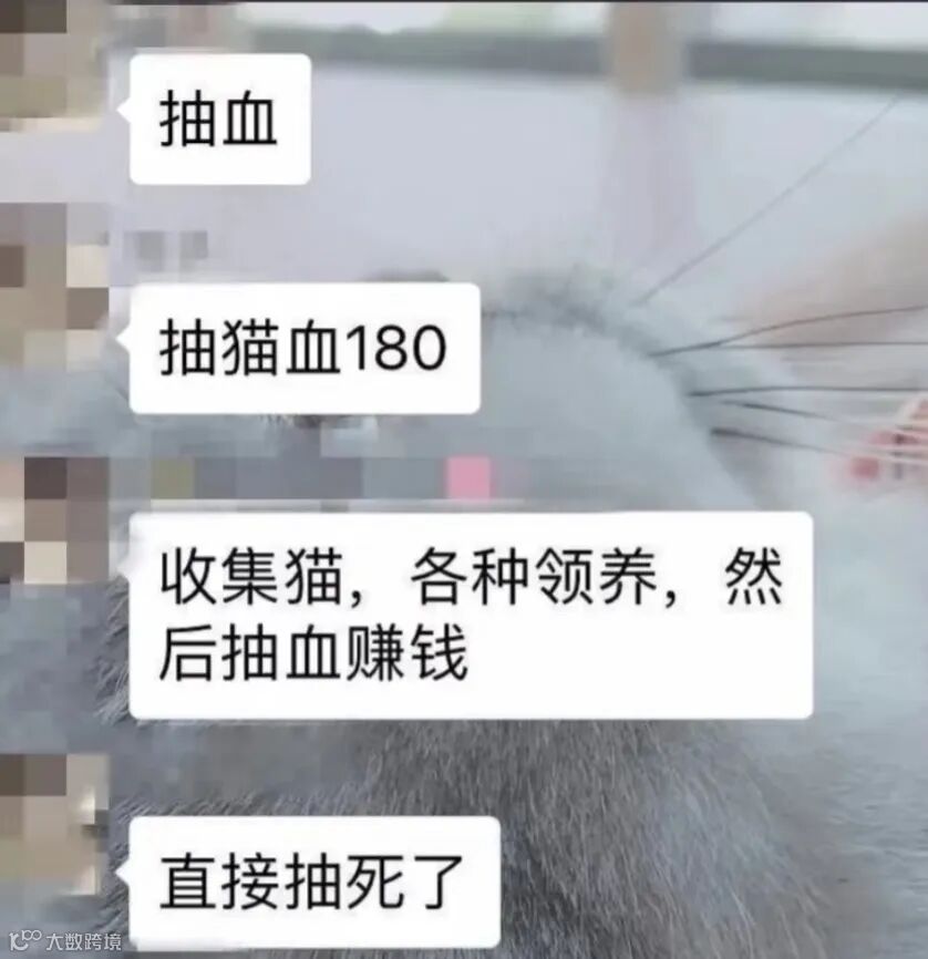 据爆料显示,所谓的“正规血库”,实为城郊作坊,通过抓捕流浪猫或低价收购,将边际成本压至零。血液采集完全忽视安全规范,单只猫血液被超采至150-250ml,远超行业标准,每一只“血猫”几乎都是一次性消耗品。作坊零消毒、设备简陋、血袋存放随意,带来极高的感染风险,却能以低价迅速流入市场。
