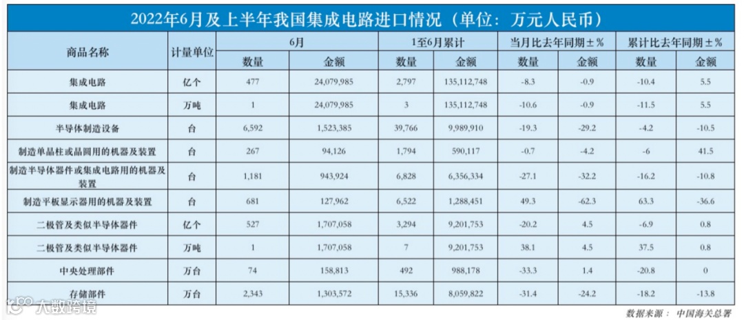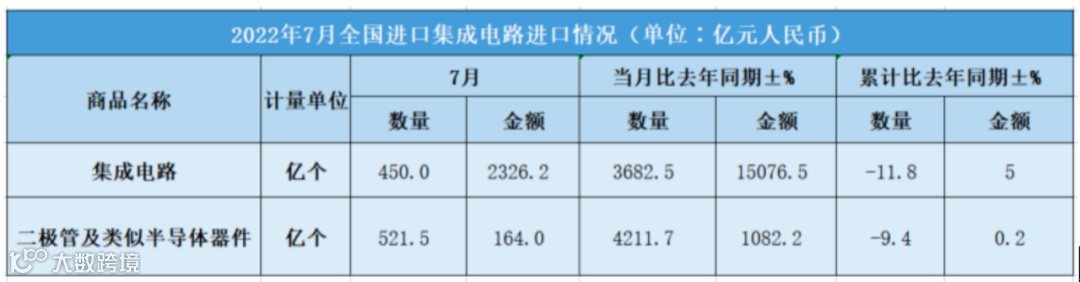 8月10日,海关总署发布最新统计数据显示,2022年前7个月我国货物贸易进口总值达10.23万亿元。其中,集成电路进口总金额为1.58375万亿元人民币。