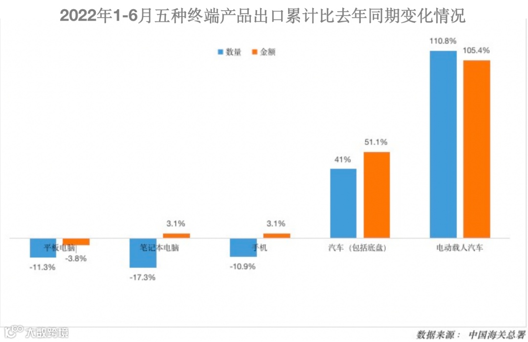对应进口,在平板电脑、笔记本电脑、手机、汽车和电动载人汽车五种主要终端产品出口数量的变化中,下降主要集中在平板电脑、笔记本电脑以及手机等消费电子领域,虽然笔记本电脑和手机的出口金额呈现正增长,但涨幅较小。