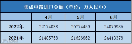 本文将以2022年上半年(1-6月)为节点进行分析。今年上半年,我国货物贸易进口总值达8.66万亿元。其中,集成电路进口总金额为1.3511万亿元人民币。这意味着,在今年上半年我国的进口总值中,集成电路占比约为15.6%。超过同期国内原油进口金额1.1633万亿元人民币,持续占据着我国第一大进口商品的地位。