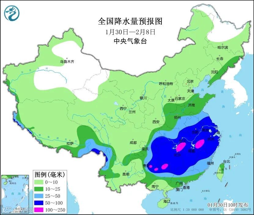 未来10天(1月30日至2月8日),中东部有大范围雨雪天气,其中黄淮、江汉、江淮、江南、华南中北部及贵州东部等地累计降水量有10~40毫米,部分地区有50~80毫米,南方局部有90~150毫米;西北地区东部、华北、东北地区东南部等地累计降水量有3~10毫米;上述大部地区降水量较常年同期显著偏多。