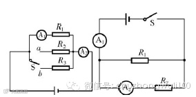 5.如左下图所示,电源电压保持不变,当开关S接a时,电流表A2上的示数与A1上的示数之比为5∶3,当开关S接b时,电流表A2上的示数与A1上的示数之比为3∶2,则电阻R2与R3阻值之比为_____