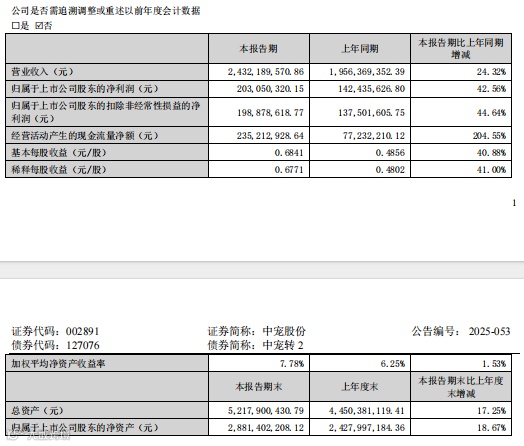 财报显示,中宠股份2025年上半年实现营业收入24.32亿元,同比增长24.32%,归属于上市公司股东净利润达到2.03亿元,同比增长42.56%,增速远超营收增长。