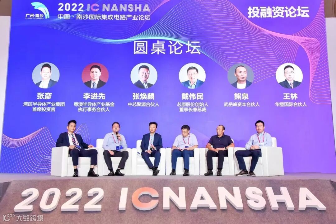 圆桌论坛环节,嘉宾从左到右依次为:湾区半导体产业集团首席投资官张彦;粤澳半导体产业基金、执行事务合伙人李进先;中芯聚源合伙人张焕麟;芯原股份创始人、董事长兼总裁戴伟民;武岳峰资本合伙人熊泉;华登国际合伙人王林。