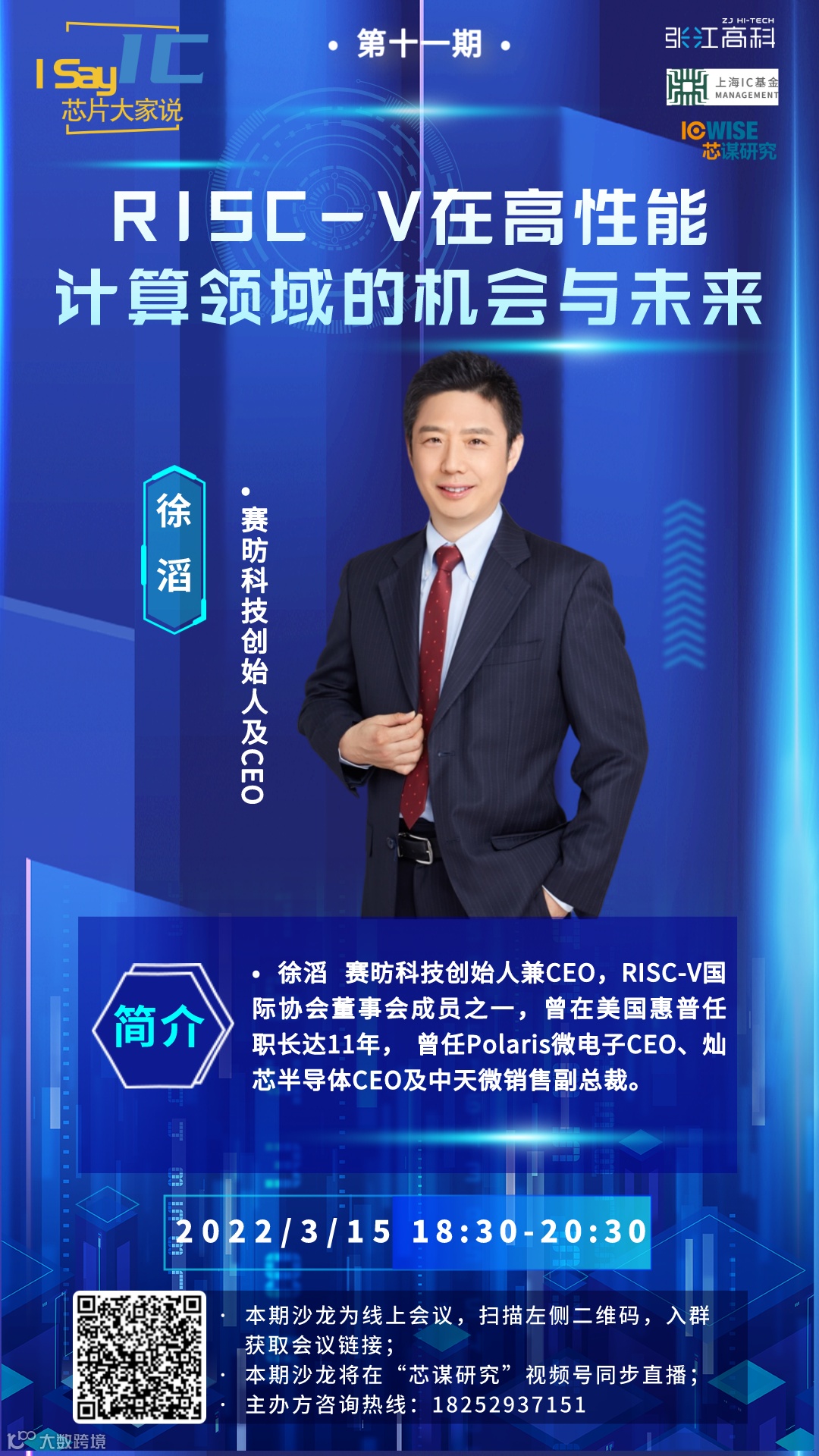 2022年3月15日(周二)晚,第十一期“芯片大家说”产业沙龙活动将再次与大家见面,受疫情影响,本期沙龙将改为线上模式进行。在本次活动中,我们邀请到了赛昉科技创始人及CEO徐滔先生为大家带来关于RISC-V产业的深度解读,共话RISC-V在高性能计算领域的机会与未来。