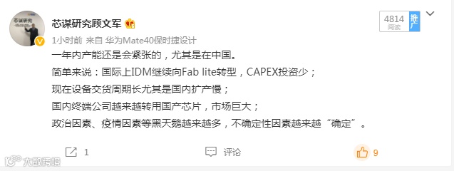 芯谋研究首席分析师顾文军曾在其微博上提到:“一年内,芯片产能还会紧张,尤其是在中国。”芯谋研究之所以提出这样的论断,基于以下几点原因。