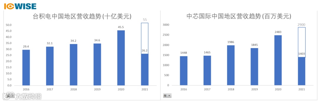 如上图所示,2016年至2021年,台积电、中芯国际等主要代工厂的中国地区营收几乎都达到翻倍的成长。芯谋研究预估2021年台积电中国地区营收将达550亿美元,同比增长20.88%;2021年中芯国际中国地区营收预计达29亿美元,同比增长16.79%。