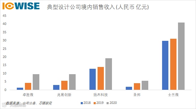 上图是这五家公司2018-2020三年来在境内销售收入的比较图。从图中可以看到,2018-2020三年内,这五家典型设计公司在国内销售收入增长明显,尤其在2019-2020年,销售收入涨幅更高。从这五家上市企业的销售额增长率可以反映出国内终端市场对国产芯片的认可以及国产芯片猛烈的发展势头。