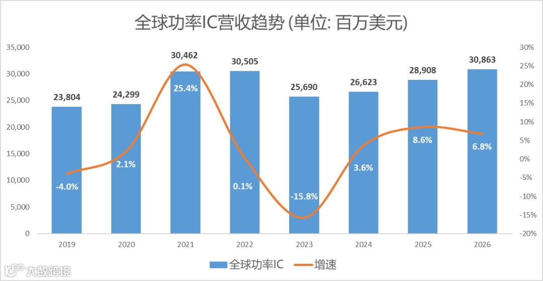 据芯谋研究统计,2021年全球功率IC市场规模为305亿美元。2022年保持稳定。2023年,全球半导体芯片、特别是DRAM等存储器价格的大幅下滑、库存消化、市场竞争将导致全球半导体市场和全球功率IC大幅下滑,之后将恢复增长态势。