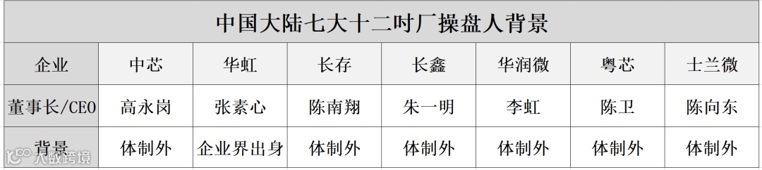 不仅“四大”,再延伸来看中国大陆七大12吋企业的操盘者:士兰微的陈向东、华润微的李虹和粤芯的陈卫皆是体制外的专业人士。
