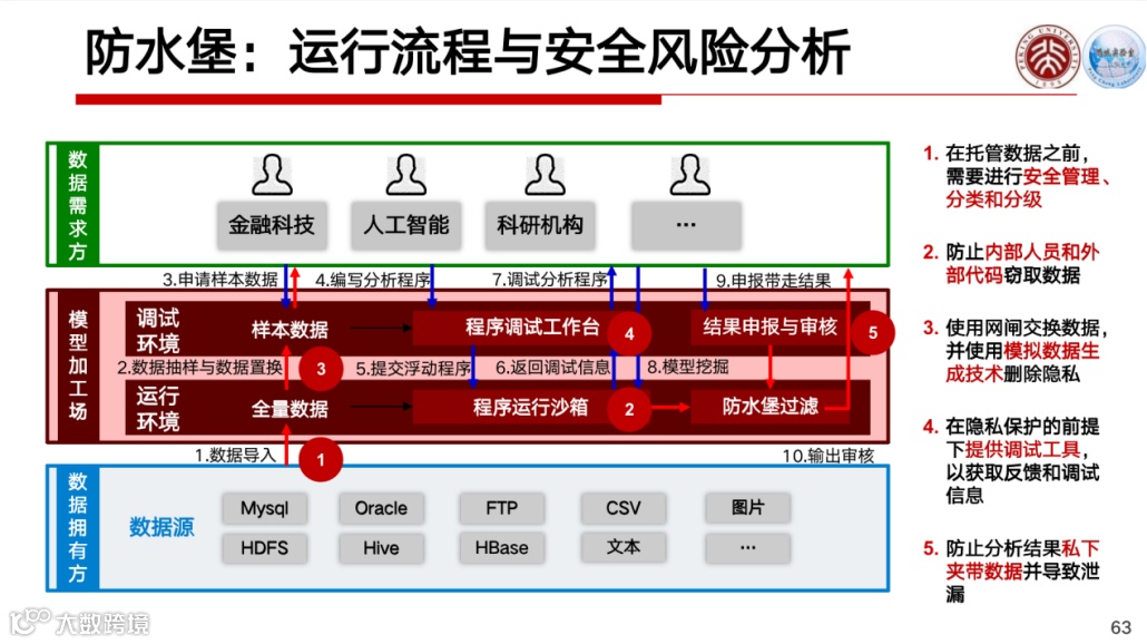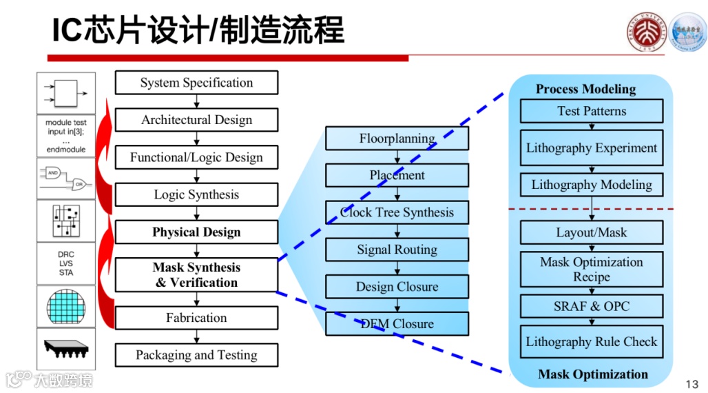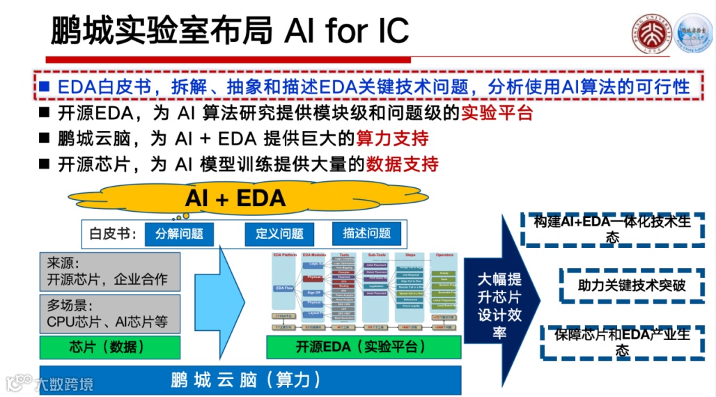 鹏城实验室的AI for IC布局 目前来看,人工智能融入集成电路产业面临着三大问题:缺少问题,如何定位EDA中有价值且可尝试用AI解决的问题?缺少数据,如何获取大量芯片数据,用于训练AI模型?缺少平台,如何验证一个算法的有效性,并将其转化为系统成功?如何构建属于IC的ImageNet和TensorFlow,把AI的强大能力嫁接到IC设计和EDA工具领域?接下来我为大家介绍下鹏程实验室在这方面的进展。鹏城实验室是作为国家战略科技力量之一,主要聚焦网络、通讯、智能等方向。鹏城实验室希望将人工智能的经验在不同领域融合发展,集成电路是其中一个重要领域。我们首先考虑到了EDA,希望用开源办法做EDA,在EDA耗时最长的部分用人工智能取代人力。我们的思路是先从数据库切入,把EDA比较难的问题一个模块一个模块地用AI算法替换,这在我们发布的EDA白皮书中有较为详细的介绍。鹏程实验室的开源EDA实验平台,底层基础硬件是与华为联手建设的鹏城云脑,做16位半浮点运算,算力可达10的18次方每秒。中间层是集成软件,上层是云脑软件平台。就在昨天11月12日,国际人工智能算力性能排行榜AIPerf500发布,“鹏城云脑II”蝉联榜首。不同的厂商数据都上云后,数据的安全性如何保证?鹏城云脑专门设计了一套名为DPI的数据程序接口,提供一套框架和保护措施,构建防水堡。把数据、模型应用中间用DPI隔开,再引入一套保护机制,从数据拥有方、模型加工厂、数据需求方,在模型加工厂和下面数据拥有方之间增加一整套可行环境机制,使得拥有方完全掌控数据的情况。