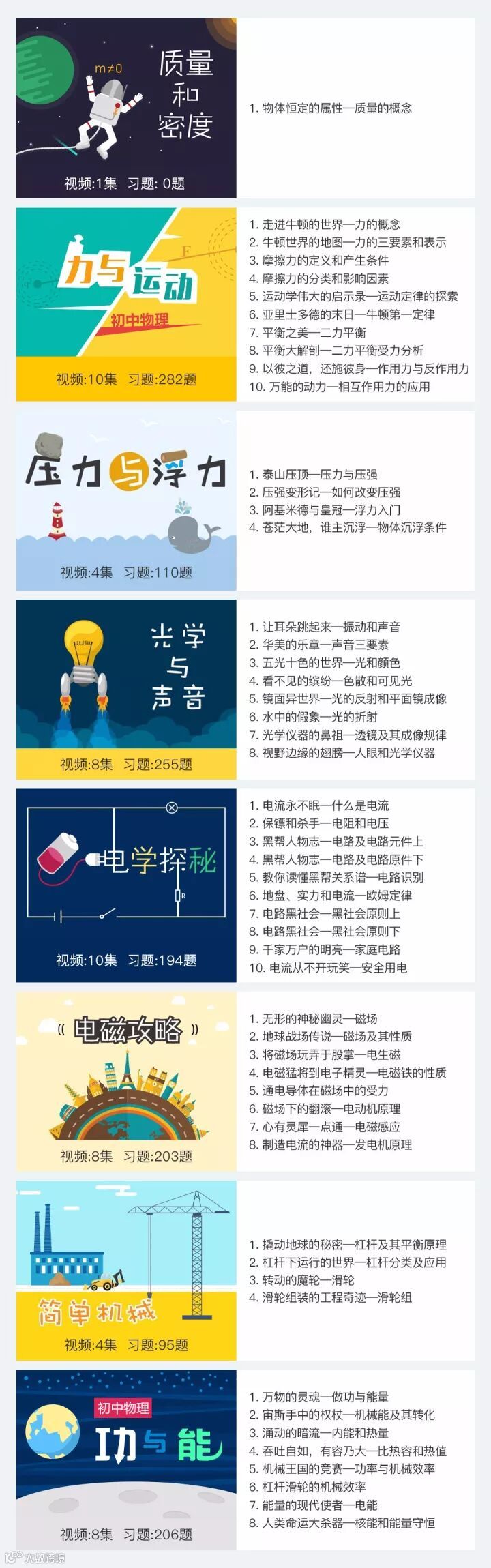 超级课堂的物理课和教材同步,分为光学与声音、力与运动、压力与浮力、质量与密度、功与能、简单机械、电学探秘、电磁攻略等课程包。对初中物理的所有概念、考点,都有详细讲解。