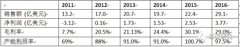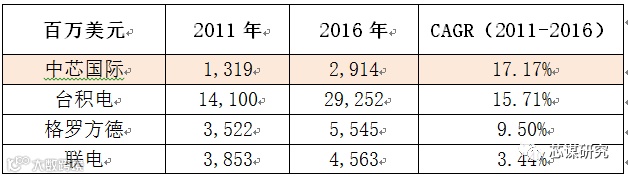 全球前四大代工厂2011年至2016年 年复合增长率排名