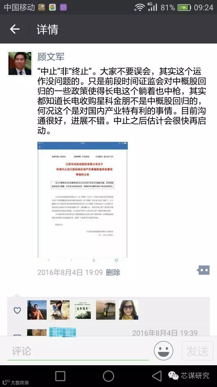 2:长电科技:8月4日长电科技发公告“申请中止发行股份购买资产等”,当时也是众说纷纭。芯谋研究第一时间分析认为““中止”非“终止”。大家不要误会,其实这个运作没问题的。只是前段时间证监会对中概股回归的一些政策使得长电这个躺着也中枪,其实都知道长电收购星科金朋不是中概股回归的,何况这个是对国内产业特有利的事情。目前沟通很好,进展不错。中止之后估计会很快再启动。”