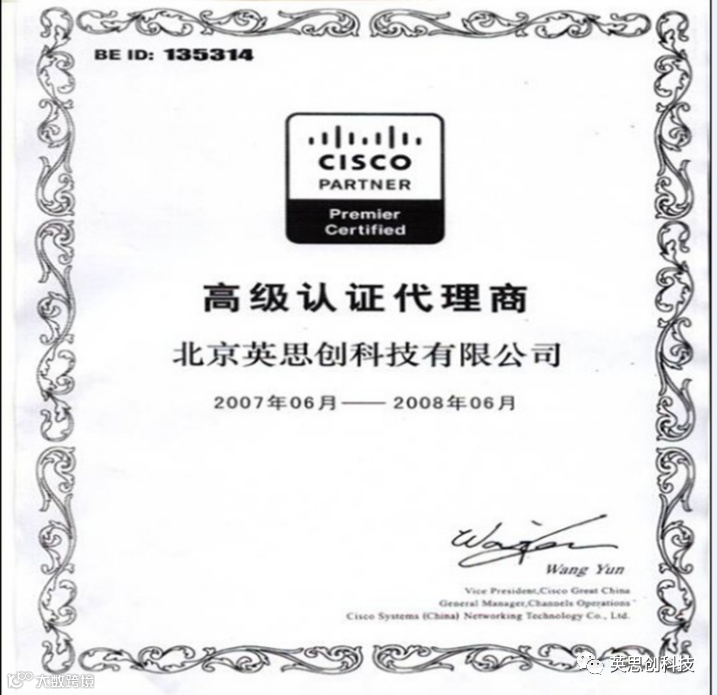 通过与Cisco公司长时间的合作,公司的综合实力得到Cisco的肯定, 2006年6月公司正式成为Cisco的认证合作伙伴,自此公司将与Cisco公司展开更紧密合作,有机会学习国际IT大企业的长处,结合Cisco公司的优势,我公司将会更好的为客户提供优质的IT系统解决方案。