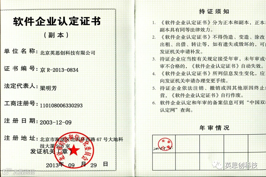 公司于2004年8月31日一次性通过了北京市科委组织的软件技术企业认定,该认定充分界定了公司的主营产品为具有自主知识产权的软件,肯定在软件开发上的巨大投入、在软件领域所取得的成绩。