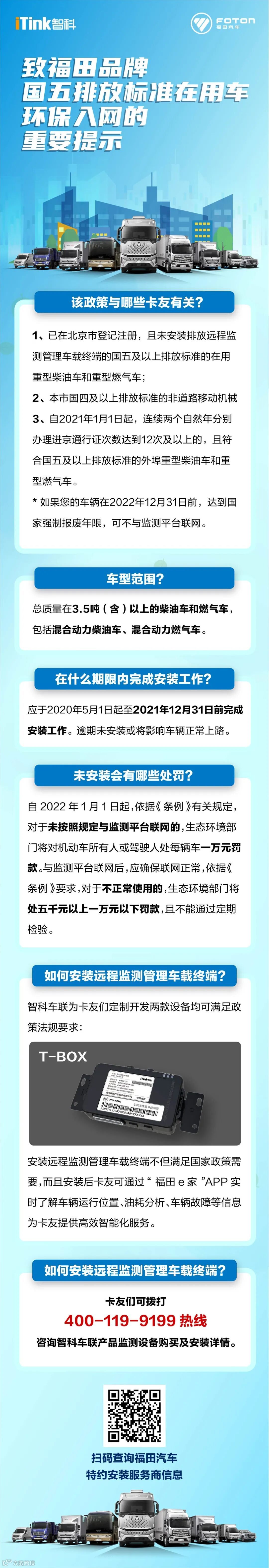感谢您长期以来对福田汽车的支持。按照《北京市机动车和非道路移动机械排放污染防治条例》和《北京市重型汽车和非道路移动机械排放远程监测管理车载终端安装管理办法(试行)》的要求,在本市登记注册的国五及以上排放标准的在用重型柴油车和重型燃气车的所有者或者使用者,应于2021年12月31日前与市生态环境局联网。自2020年5月1日实施以来,广大福田汽车所有者或使用者正在积极开展工作。目前完成时限已经临近,现再次将有关要求提示。