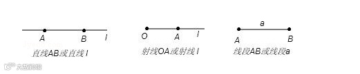 ①直线:用一个小写字母表示,如:直线l,或用两个大写字母(直线上的)表示,如直线AB.
