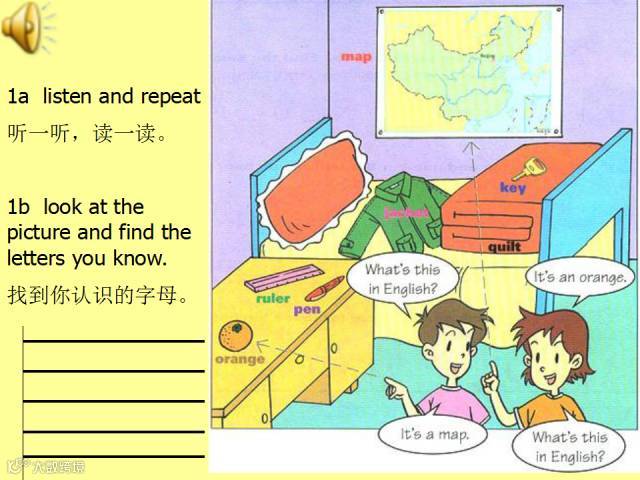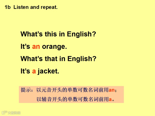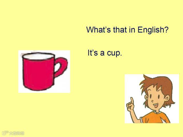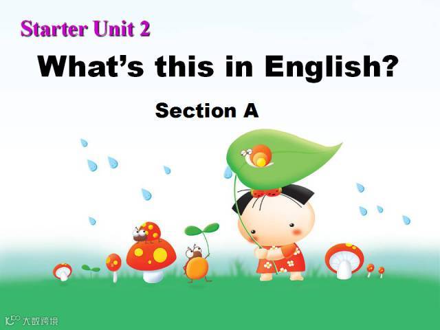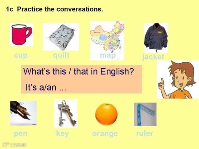 句型What’s this in English? 意为“这个用英语怎么说?”用来询问某物,回答时要用“It is/ It’s a(n) + 名词”,其中 it 用来指代 this 或that。 what’s = what is, 意为“是什么”。英语中用来提问的特殊疑问句总是放在句子的开头, 这一点与汉语不同,同学们要特别注意英语的语序。