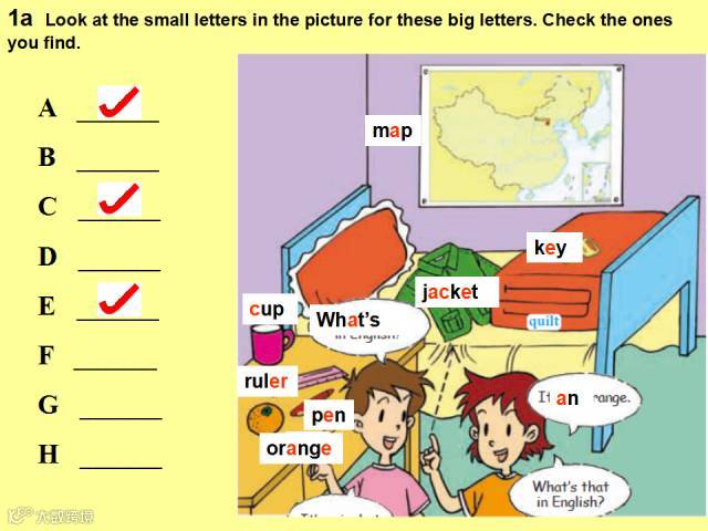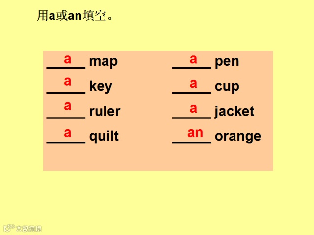 二、1.in Chinese 2.a quilt 3.an orange 4.a jacket 5.a map 6.your pen 7.用英语 8.那把钥匙 9.这支直尺 10.谢谢你