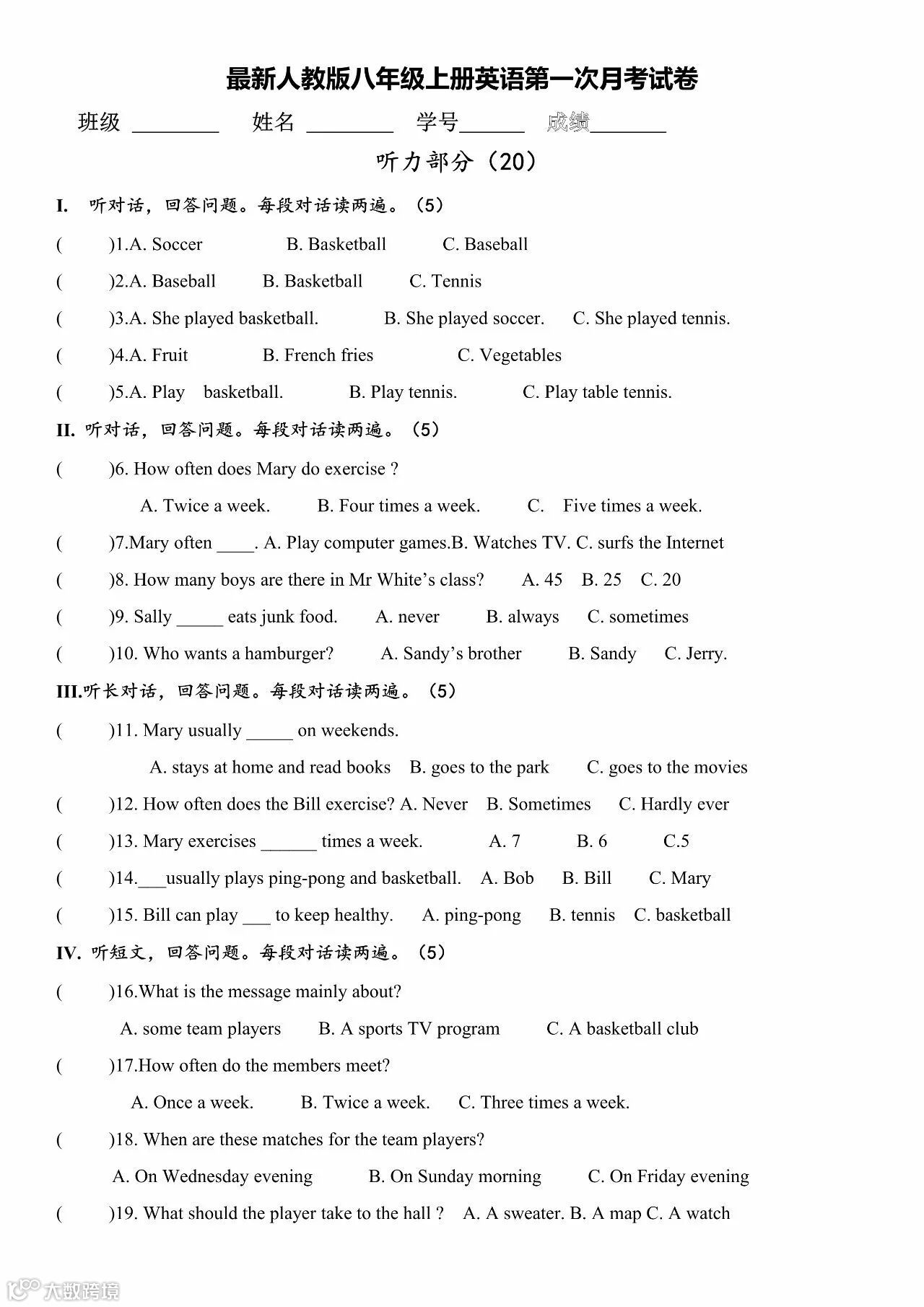 八年级英语(上册)第一次月考试卷