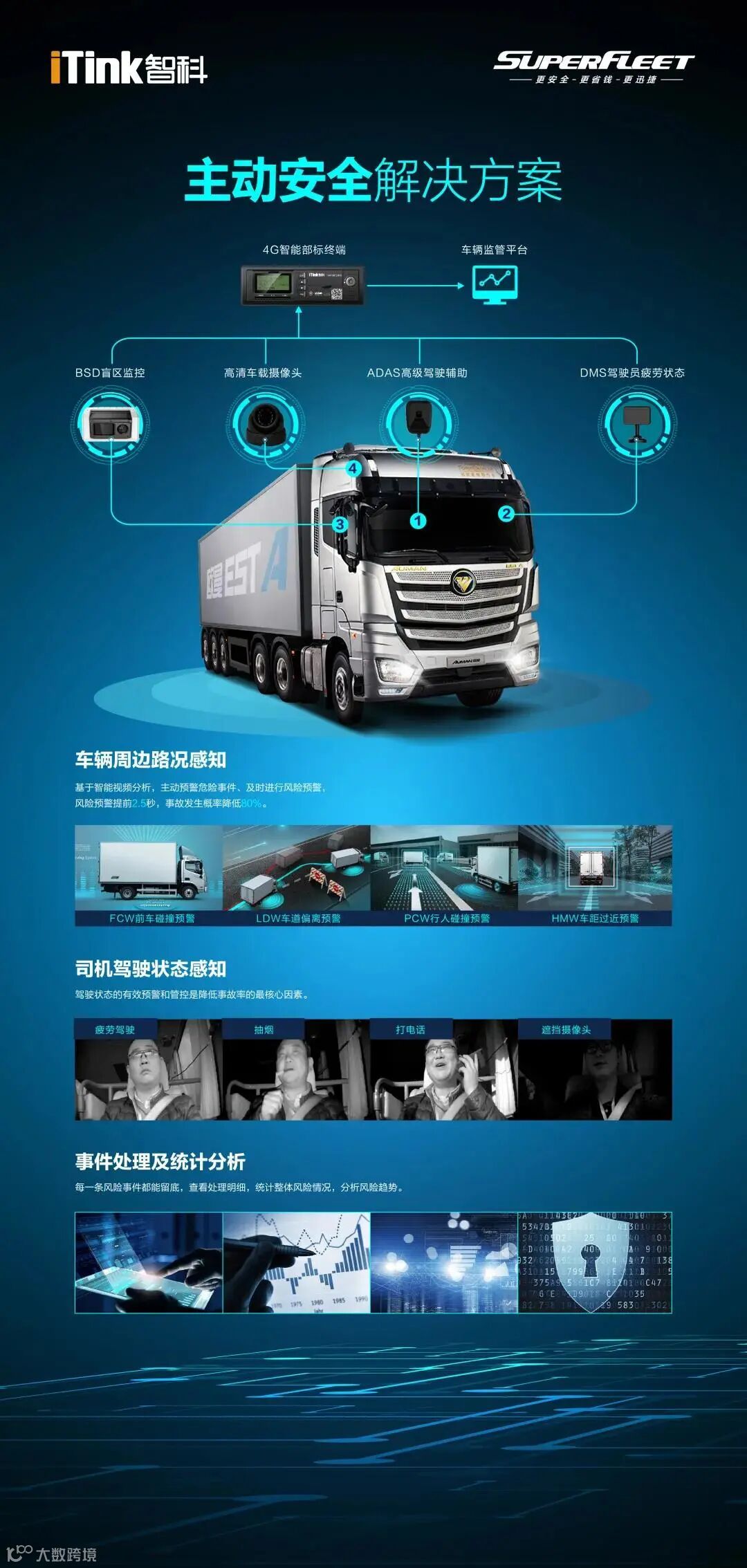 为了助力货运网约车监管合规化,高效保障司乘安全,智科车联平台基于4G智能部标终端设备,围绕车辆定位、BSD盲区监控、高清车载摄像头、ADAS高级驾驶辅助和DMS驾驶员疲劳状态等多重安全监控机制提升司乘人员安全指数。