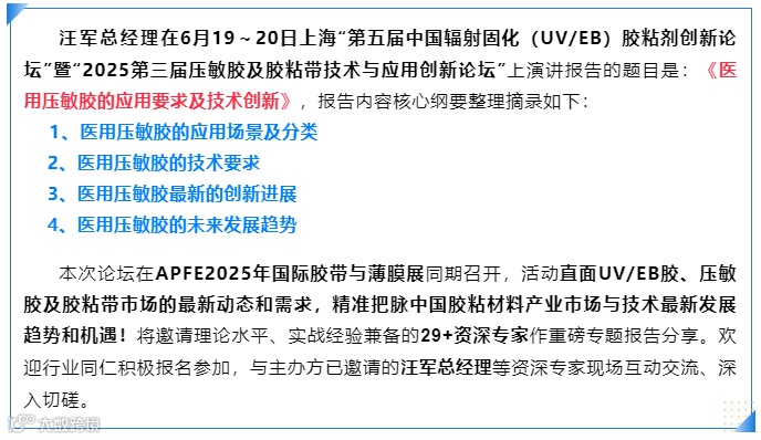 此次邀请不仅是对汪军先生在胶粘剂领域专业造诣的高度认可,更彰显了英创科技在环保胶粘剂技术研发与创新应用方面的领先实力。作为行业深耕者,英创科技始终致力于推动压敏胶技术在医疗领域的突破,本次演讲将围绕医用压敏胶的功能性需求、安全性标准及前沿技术方向展开深度分享,为行业发展提供创新思路与实践参考。