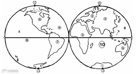 (1)填出图中数字和字母分别表示的大洲和大洋名称: