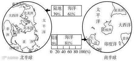 地球表面,陆地面积占29%,海洋面积占71%,所以形象地称地球为“三分的陆地,七分的海洋”。北半球(陆半球),南半球(水半球)