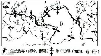 (2)在六大板块中, ______ (填名称)板块几乎全部是海洋,两大洲同属于一个板块的最大的板块是 ______ 板块.