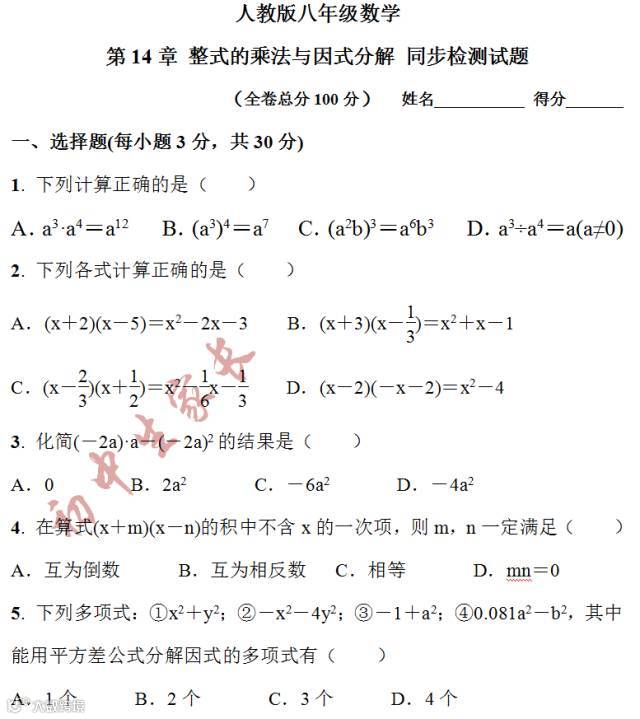 初二数学丨重点中学第14章同步检测题(附答案)测试孩子能得多少分?