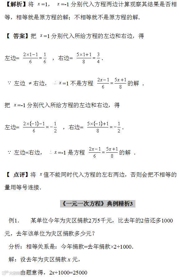 ⑵ 方程的解的检验方法,首先把未知数的值分别代入方程的左、右两边计算它们的值,其次比较两边的值是否相等从而得出结论。