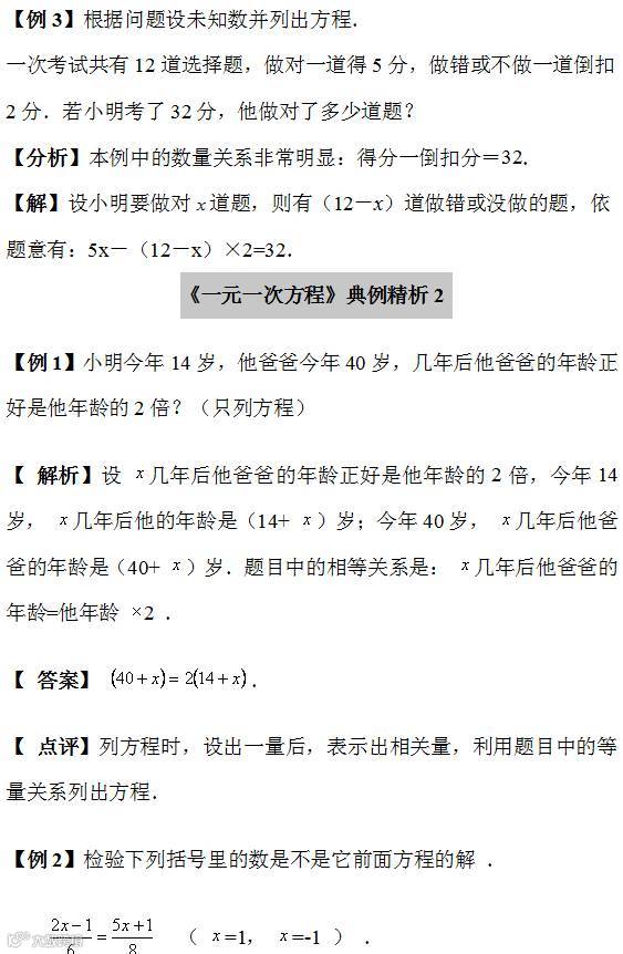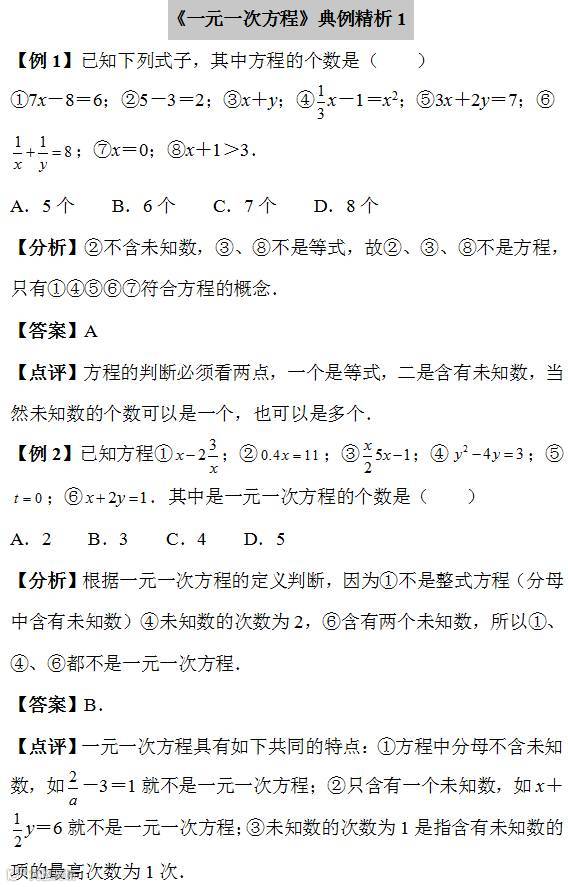 2. 一元一次方程:只含有一个未知数(元)x,未知数x的指数都是1(次),这样的方程叫做一元一次方程。
