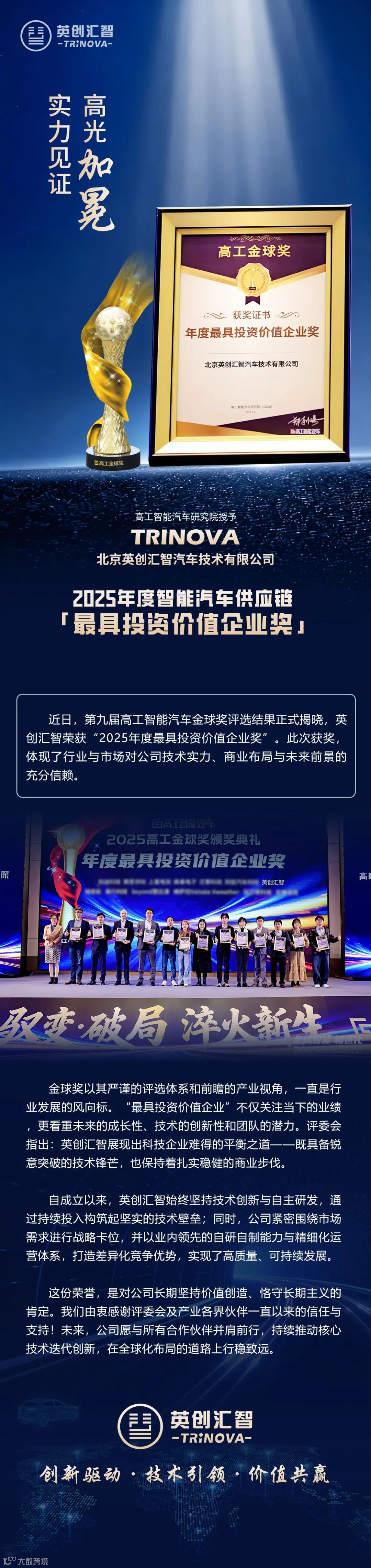 英创汇智先后入选国家科技型企业、国家高新技术企业、国家级专精特新“小巨人”企业,并获得了重庆市科技进步一等奖、北京市科技进步二等奖、安徽省科技进步三等奖、天津市发明奖、国家工信部自主ESC技术强基工程支持,还通过了ISO9001、ISO14001、IATF16949、ISO26262功能安全、CNAS、VDA6.3、ASES等质量体系认证。