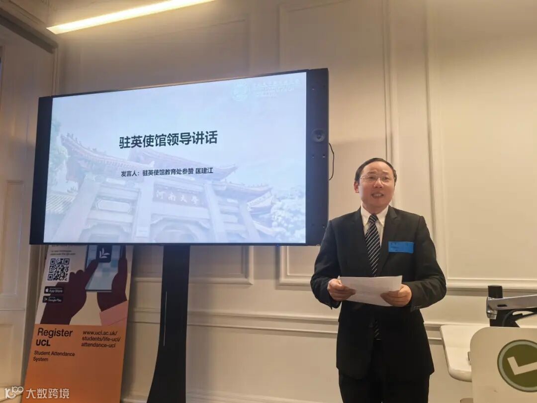 中国驻英使馆教育处参赞匡建江在致辞中充分肯定了河南大学英国校友会成立的重要意义,他指出,海外校友组织是促进民心相通、深化科教合作、展示真实立体中国形象的重要纽带,希望英国校友会紧扣国家与地方发展需求,搭建高质量交流平台,生动讲好中国故事、河南故事与河大故事。