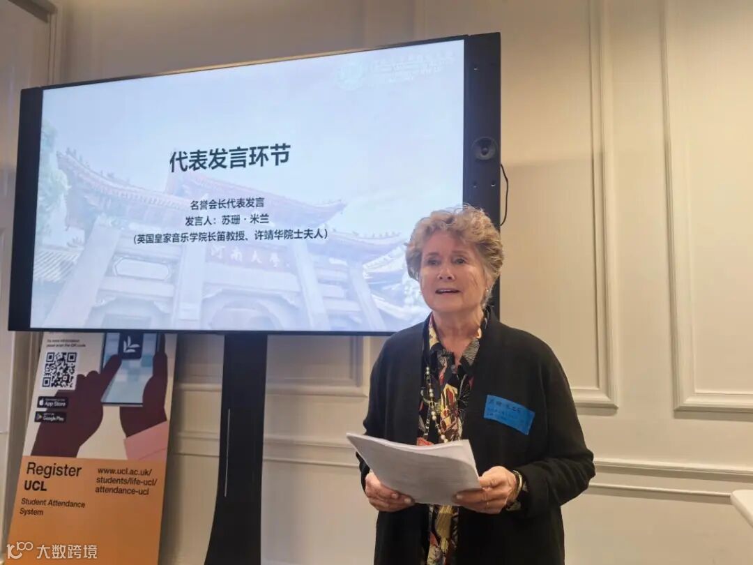 因年事已高,许靖华院士未能亲临现场,其夫人、英国皇家音乐学院教授苏珊·米兰受邀代为领取聘书并致辞。苏珊·米兰在发言中,首先代表许靖华院士向河南大学以及英国校友会筹备组致以诚挚感谢。她回顾了许靖华与河南大学跨越两代、绵延至今的深厚渊源,强调这份凝结着“黄河情、家国心、河大缘”的情谊已在英伦大地扎根生长。她表示,担任英国校友会名誉会长是许院士学术追求与家国情怀的延续,期待以校友会为桥梁,让更多英国友人走进河南、读懂河大,推动中英在科学研究、人文艺术等领域开展更深度的交流合作。
