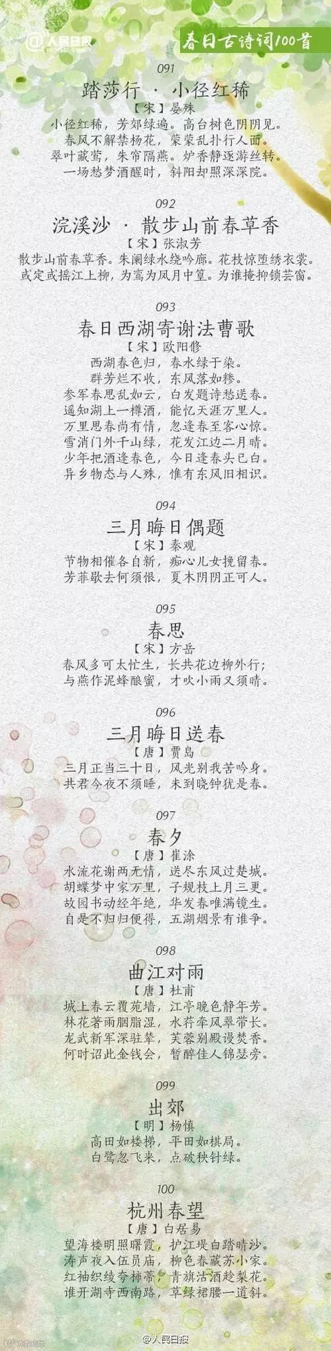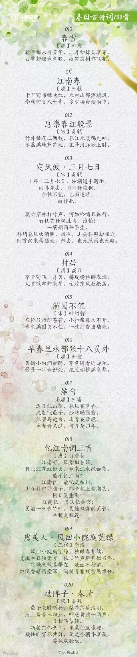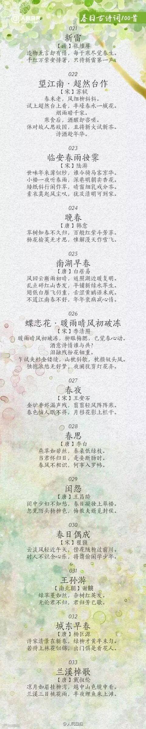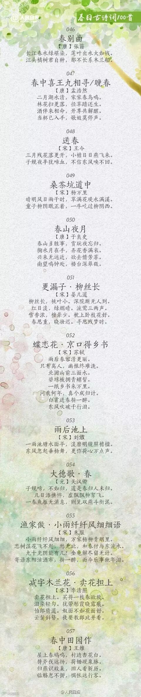最是一年春好处,今天就与各位家长朋友们分享100首关于春的诗歌,作为学生时代必背的诗词,不仅值得收藏了给孩子当做写作、积累的资料,自己还能品味古诗词里春的韵味,你们都还能否背出来,都还记得几首?